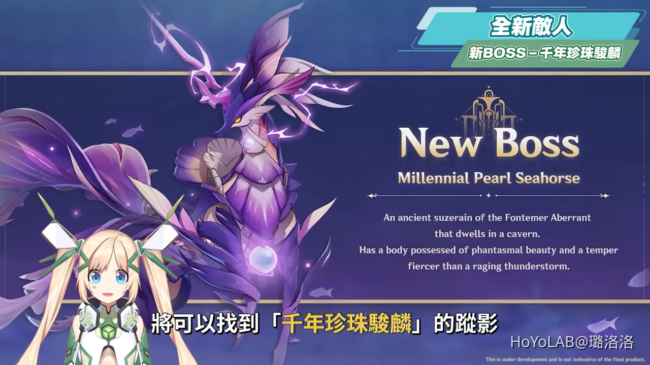 在梅洛彼得堡附近水下的一處岩窟中,將可以找到「千年珍珠駿麟」的蹤影,是由泡泡海馬成長而來的頂尖掠食者,其頭部下方的珍珠凝聚了雷元素的結晶,攻擊方式主要為雷屬性的攻擊,有著更猛烈的元素攻擊與防禦能力。