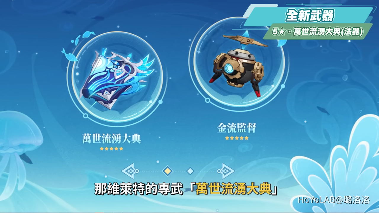 那維萊特的專武「萬世流湧大典」是針對其技能機制設計的輸出法器,副屬性提升暴傷,武器效果可以提高生命值上限,並且在自身生命值變動的時候,使重擊的傷害提升,並且透過觸發機制回復能量。搭配逐影獵人聖遺物的效果,相信又會是變成一個面板數值怪物。
