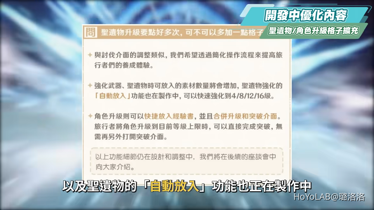 聖遺物強化的部分也在優化排程中,只要在強化聖遺物或是武器時,可以放入的素材數量也將會增加,以及聖遺物的「自動放入」功能也正在製作中,並且可以一次強化到4的倍數的等級。而角色升級則是可以快捷放入經驗書,同時合併升級和突破介面,只要將角色等級升級到等級上限時,就可以直接完成突破。