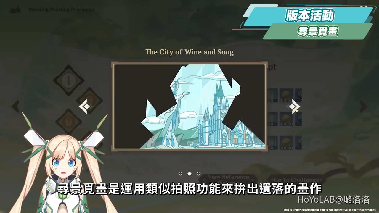 尋景覓畫是運用類似拍照功能來拚出遺落的畫作,將畫作中缺失的一塊對準地圖上的景物後,即可完成修復畫作。完成這三個玩法可以提升詩歌大會的活動熱度,用來兌換活動限定法器。