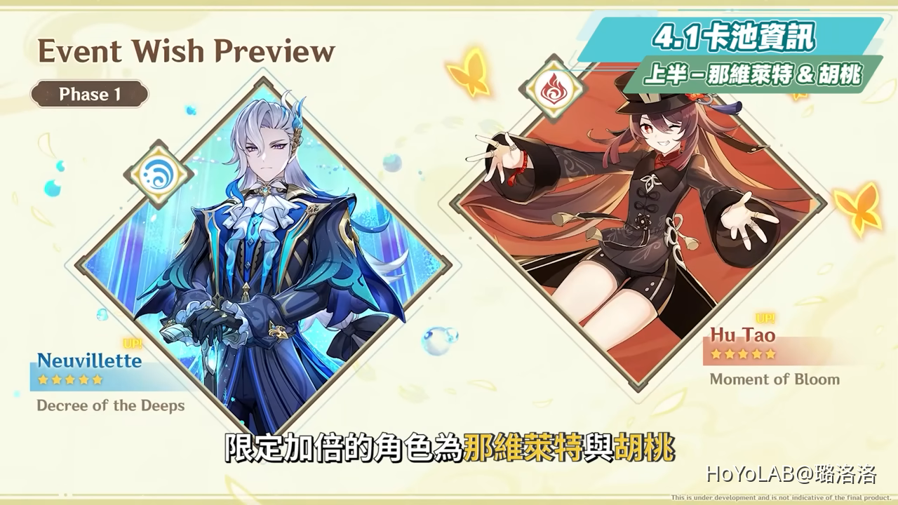 4.1上半卡池將在9/27實裝,限定加倍的角色為那維萊特與胡桃,那維萊特為水元素輸出法器角色、胡桃則是早期版本璃月3C的重點輸出火C,新角色的實測與抽取建議洛洛會在版本更新後製作相關影片,而胡桃則是經典的老角色了,相關的配隊和復刻Q&A也可以再回去查看先前的影片複習。