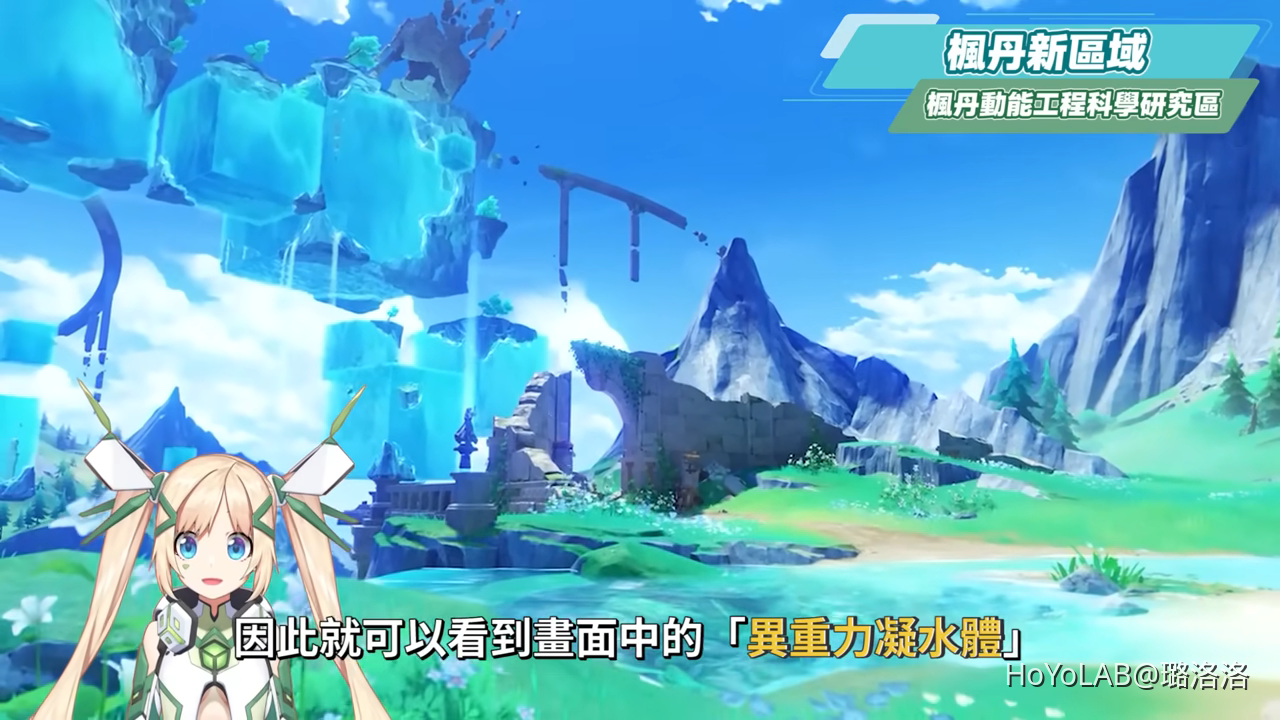 因為楓丹的某些「科技與狠活」,讓一處區域產生爆炸,因此就可以看到畫面中的「異重力凝水體」,這些水體使得楓丹科學院失重並漂浮在空中,在水體裡面也能發現殘破的科學院舊址。屆時可以透過水道傳送到空中的水體進入探索。也因為在先前楓丹的歷史中,楓丹動能工程學***一直在設法對抗洪水,並且認為始基礦是能夠打開救贖大門的鑰匙,因此艾德溫.伊斯丁豪斯在生前設計了能夠抵銷重力效果的「實驗性場力發生裝置」,也就是在此處駐守的新BOSS,只是最終發生了事故使得這項裝置實驗未成功,在失控後也就留在了科學院的舊址。