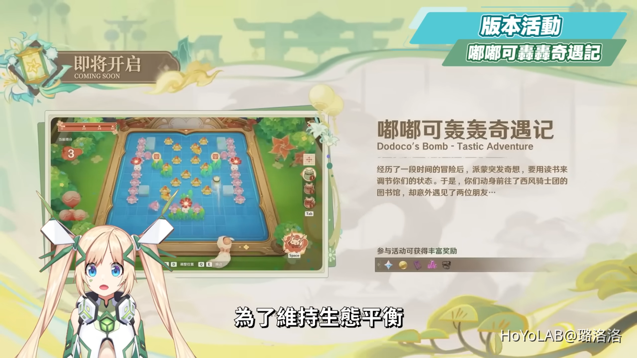 可莉在遊玩的過程中發現蒙德的水域出現了來自須彌的外來入侵魚類,為了維持生態平衡,騎士團需要處理這些入侵物種,而可莉這時就可以光明正大的炸魚了,同時為了不讓可莉無聊,貼心的麗莎還設計了有趣的小遊戲,我們可以操作畫面中的嘟嘟可來投擲出不同類型的蹦蹦炸彈,用來擊敗角角魚大軍。