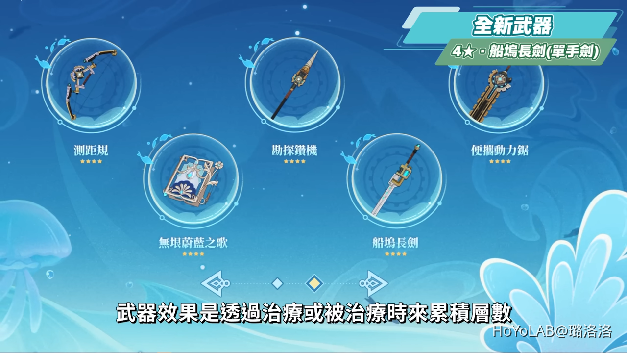船塢長劍長得有點像調查兵團的武器,副屬性提升的是生命值,武器效果是透過治療或被治療時來累積層數,累積滿層數後可以透過元素戰技或元素爆發來獲得元素精通提升,同時也為裝備者恢復能量,處於後台時也可以觸發武器效果,效果上來看會是沒有抽聖顯之鑰的妮露適合用的替代武器。