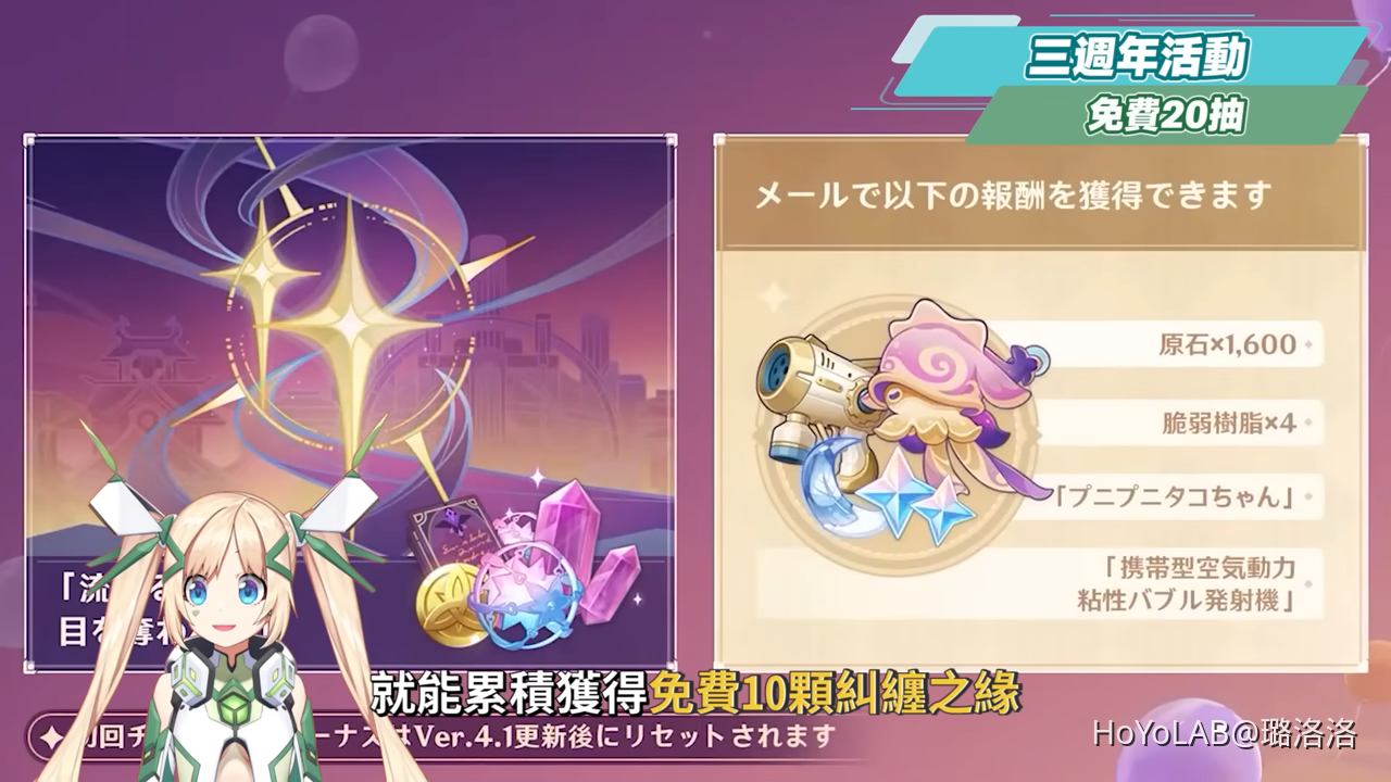《原神》也將迎來三週年,在三週年的生日中,只要登入達指定天數就能累積獲得免費10顆糾纏之緣、另外透過郵件領取也可以再獲得1600原石與4個脆弱樹脂。