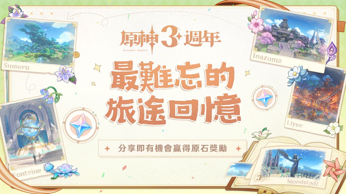 旅行者們可在社群媒體平臺上使用Hashtag「#最難忘的旅途回憶」和「#原神三週年」,分享自己在提瓦特大陸旅途過程中最難忘的回憶(形式可以是圖片或影片),並附上一段文字以及自己的《原神》遊戲UID,即視為成功參與。