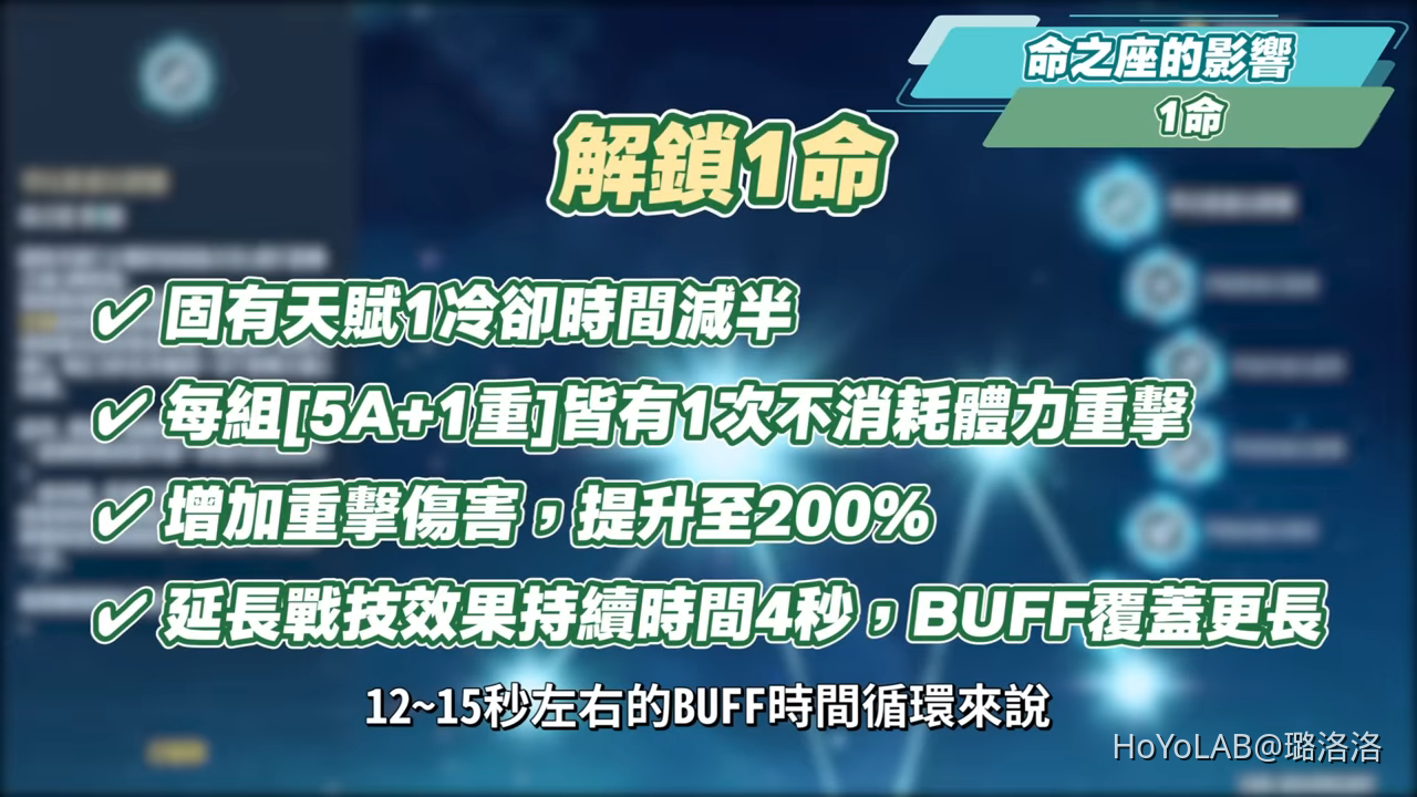 萊歐斯利的1命和那維萊特的1命都可以說是影響戰鬥體驗的命座效果,不只優化了機制也會讓傷害提升,比起專武會更建議優先解鎖1命來優化戰鬥體驗,光是敘述文字就是所有命座裡面最長的,解鎖後也好處多多。首先是使原本5秒冷卻的固有天賦1重擊優化效果能夠縮短為2.5秒冷卻,等於每一組的5A+1重輸出循環都享有一次不消耗體力的重擊,使得體力消耗大幅減少,並且重擊傷害也直接提升至200%,增傷區間提升得非常多,並且還延長戰技「懲裁」效果的持續時長4秒,總長來到14秒,搭配其他輔助角色平均12~15秒左右的BUFF時間循環來說,讓萊歐斯利的站場時間更長,不論是手法還是傷害上都能得到明顯的優化。