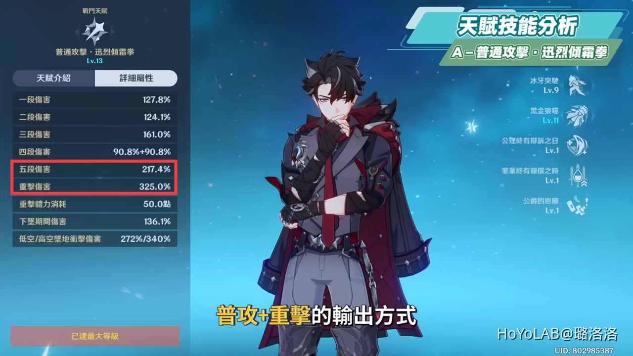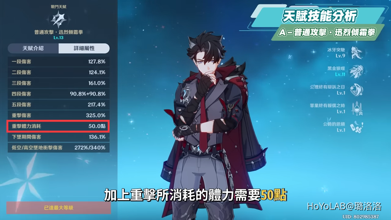 而雖然萊歐斯利的重擊傷害倍率最高,不過還是會需要搭配普攻的連擊來作Combo,加上重擊所消耗的體力需要50點,所以並不能像胡桃那樣普攻一下、重擊一下的輸出方式,總體的輸出主要會是5段普攻+1重擊的連擊方式,正好在第5段普攻時,萊歐斯利會往下揮拳,並且有一小段前搖時間,在這時接上重擊,就會再有流暢的上鉤拳攻擊,這樣的輸出方式搭配後續解鎖的1命和固有天賦,才會更完整發揮出萊歐斯利的技能機制。同時也是萊歐斯利的核心輸出與優先點高的天賦。