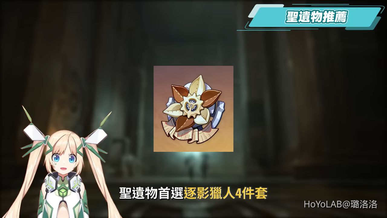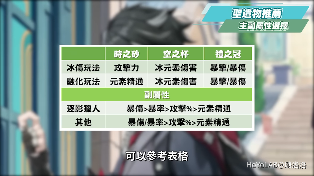 聖遺物主副屬性選擇,可以參考表格,搭配逐影獵人套裝的話,又甚至是湊雙冰共鳴的話,比較不會缺暴率,因此禮之冠可以考慮暴傷的主屬性優先,或是參考畢業面板補暴率的主屬性,而若是穿戴逐影獵人套裝雙暴達標時,並且隊伍中沒有提升攻擊力的輔助時,像是沒有班尼特、沒有滿命申鶴能覆蓋完整的BUFF時間時,也可以選用攻擊力主屬性的禮之冠,時之沙選擇攻擊力,如果有要打融化反應的話,可以替換成元素精通的時之沙,或是改拿元素精通的法器,又或是搭配提供元素精通的納西妲,空之杯選擇冰元素傷害加成。副屬性方面則主要從雙暴、攻擊力兩項來考慮,有要打融化可以再加減堆一些元素精通。