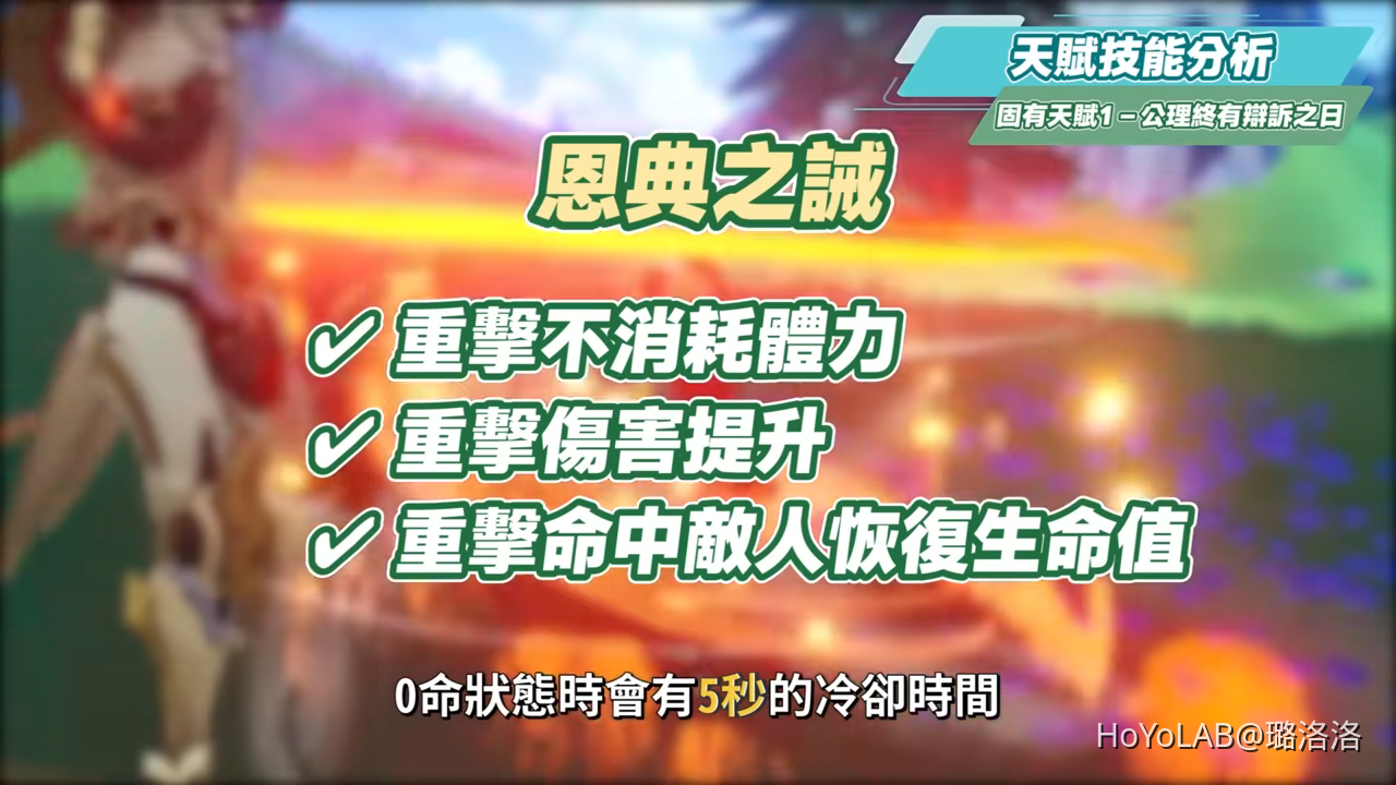 解鎖固有天賦1後,當萊歐斯利的生命值低於60%時,將會獲得「恩典之誡」的效果,會強化重擊「凌躍拳」的機制,0命狀態時會有5秒的冷卻時間,大約每打完2套5A+1重的攻擊享受1次的加成效果,正好可以使重擊不消耗體力、並且使重擊傷害提升,同時還能恢復生命值,回復量為萊歐斯利的生命值上限30%。