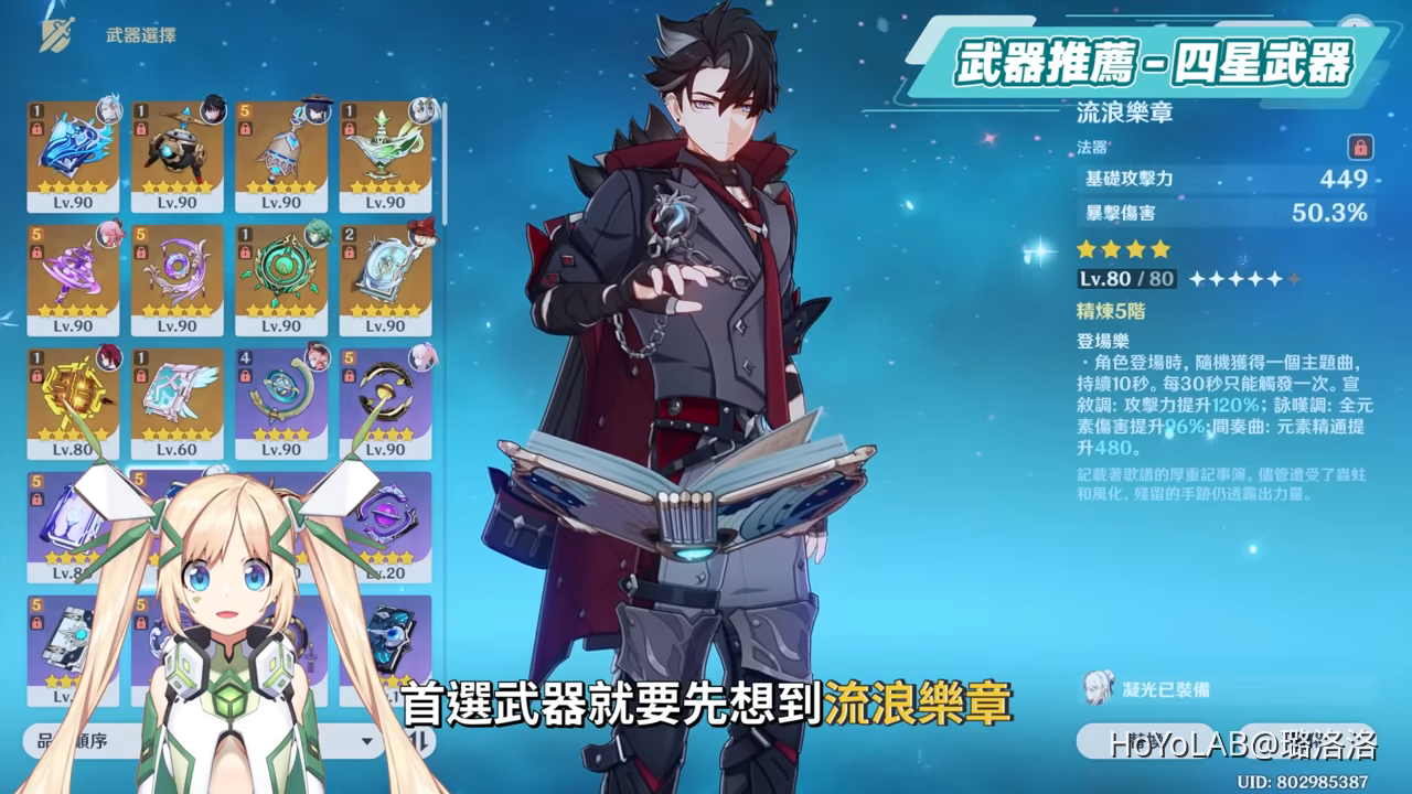 其他的五星武器就比較不如滿精煉流浪樂章,像是那維萊特的武器萬世流湧大典雖然有提供重擊傷害加成,但武器的基礎攻擊白值較低,主要是吃高額暴傷的部分,此時就需要再搭配增加攻擊力的輔助角色,例如班尼特。而四風原典則會需要站場時長來疊加BUFF,需要站到16秒才能滿層,通常最多吃到第3層就要切換角色了,0命的話更是只能吃到2層,加上暴率加成較高,要注意搭配逐影套時是否會溢出暴率。若是考慮攻擊力屬性的法器,像是天空之卷、塵世之鎖等等,若是再搭配加攻的輔助時就要注意攻擊力稀釋的問題,適合沒有搭配加攻輔助時再選擇的武器,但不如再往流浪樂章去考慮。