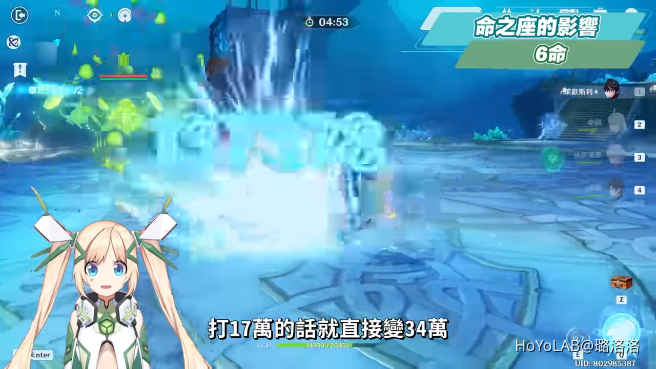 解鎖6命後就是典獄長的最強型態,傷害提升也十分明顯,主要也是提高重擊的爆發能力,重擊的暴擊率提高10%的同時,暴傷還提高80%,命中時還會額外產生一個視為重擊的冰錐傷害,直接會看到兩個重疊的高傷害數字疊加在一起,打17萬的話就直接變34萬,讓重擊傷害的占比更大,且這個額外的冰錐傷害為獨立的弱冰元素附著,只要觸發也都能產生對應元素反應。