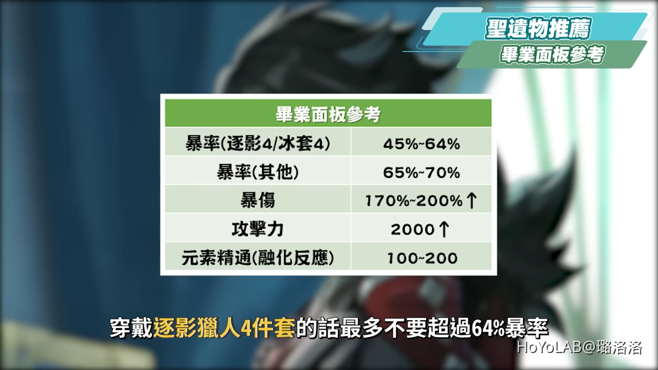 畢業面板參考也可以參考表格,穿戴逐影獵人4件套的話最多不要超過64%暴率,搭配冰套4件套時暴率要求也會比較低,因此兩個套裝可以參考差不多的暴率範圍,若是選用其他聖遺物套裝則會建議暴率在65%~70%左右,暴傷則是越高越好,攻擊力大約會落在至少2000左右,低於2000則會建議搭配加攻的輔助,像是班尼特或申鶴,或是看是否要在雙暴差不多的範圍內換成攻擊頭。若是要打融化反應的話,元素精通大約可以堆到100~200左右,堆太高的話會使沒有觸發融化反應的冰元素傷害降低太多,或是直接搭配能拉抬大量元素精通的納西妲。