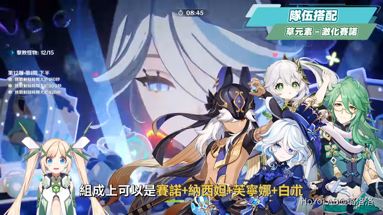 另外一隊雷元素的C位也不能沒提到賽諾,賽諾應該可以算是須彌角色裡面比較能和芙寧娜搭配的角色,因為其他須彌角色要不就是隊伍已經很完整,要不就是打劇變反應傷害比較無關,而芙寧娜提供的大量增傷加強了賽諾的傷害,尤其若你是0命賽諾體驗會更加有感,但也會建議搭配1命以上芙寧娜有個保底增傷體驗會更好,組成上可以是賽諾+納西妲+芙寧娜+白朮,若是需要抗打斷,也可以考慮再將納西妲換成鍾離、白朮可以換成琴之類的群奶角色,賽諾的站場時間長剛好可以和大招時間持續長的芙寧娜有搭配上,搭配在下半卡池復刻的官方是不是想暗示什麼呢?