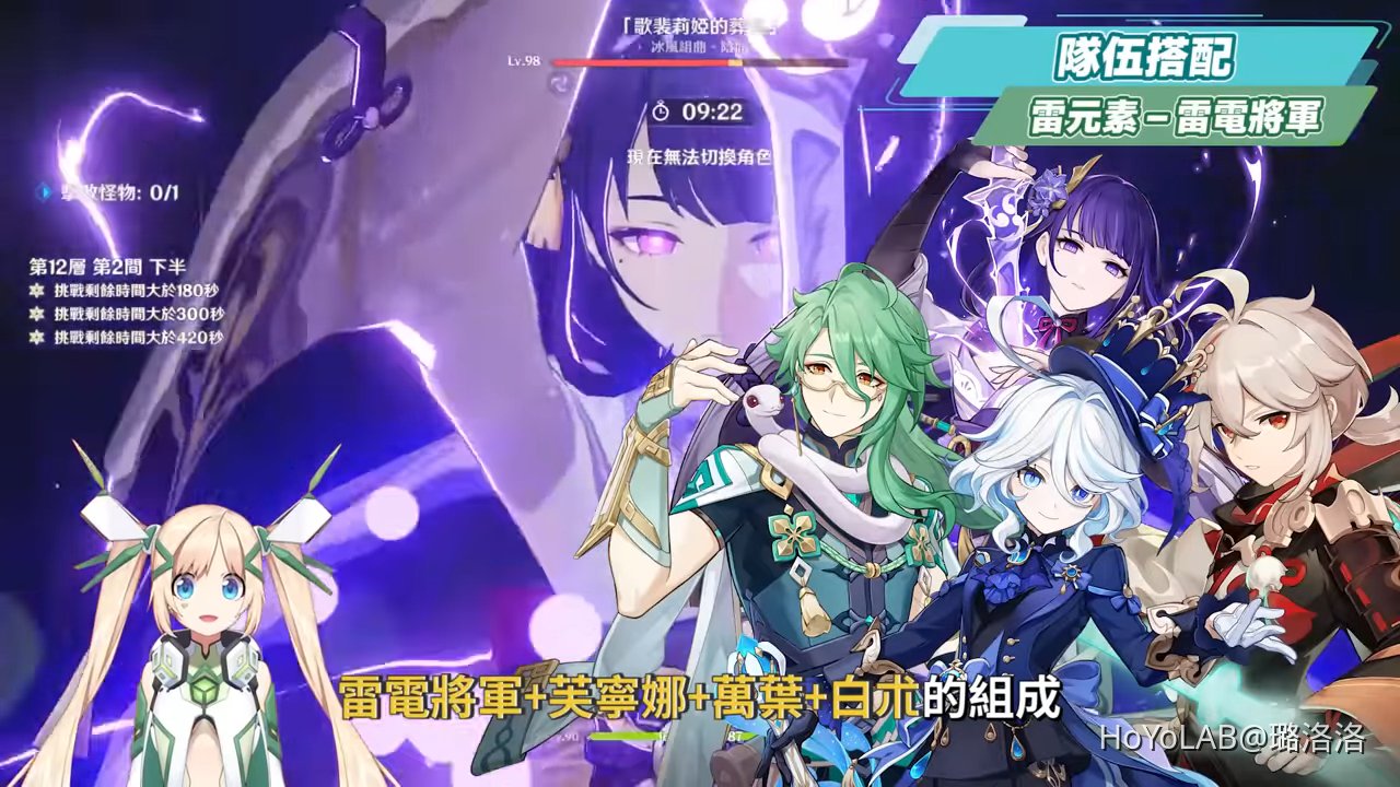 雷電將軍以往的經典陣容就是雷九萬班,但班尼特的大招對於會跑動的敵人有限制,因此芙寧娜登場後,雷九萬班也可以轉變為雷電將軍+芙寧娜+萬葉+白朮的組成,不只戰場上移動更加靈活,搭配芙寧娜和萬葉的增傷,以及白朮的草元素激化加成下,輸出體驗更好、傷害更炸,並且有落單的敵人時,沙龍成員也能大範圍補強幫忙收尾。