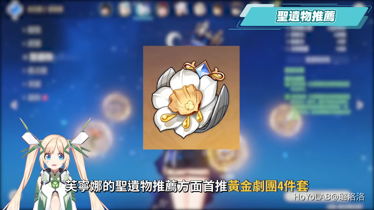 芙寧娜的聖遺物主副屬性主要先看生命值能否到40000、其次確保元素充能效率是否達標,可以參考稍後的畢業面板說明,哪項面板未達標就補哪項,而因為4命提供大幅度的回能效率,因此就可以直接用生命沙,而若是穿黃金劇團的話,由於給到的增傷區間已經很可觀,再搭配大招給的增傷已經可以將空之杯直接用生命值屬性的了。