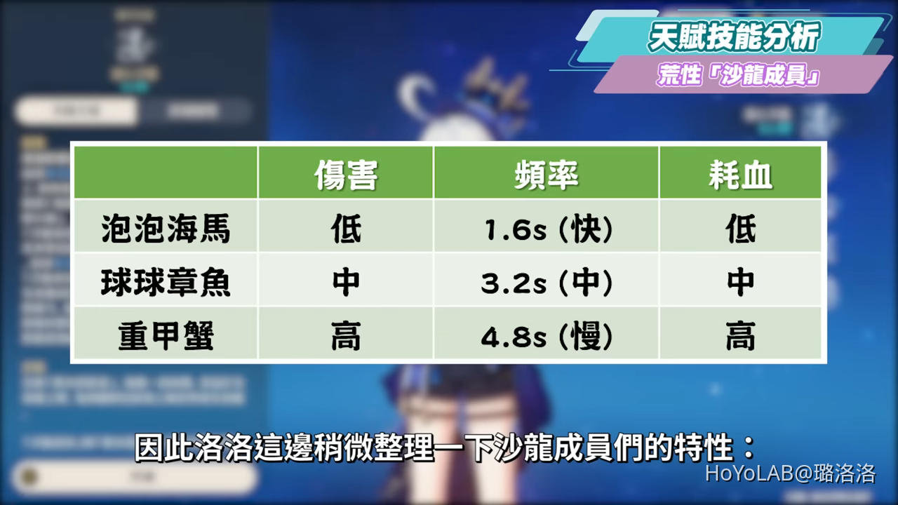 也因為這3位沙龍成員攻擊所造成的傷害、頻率,還有扣除全隊半血以上隊友的生命值%數各有不同,因此洛洛這邊稍微整理一下沙龍成員們的特性: