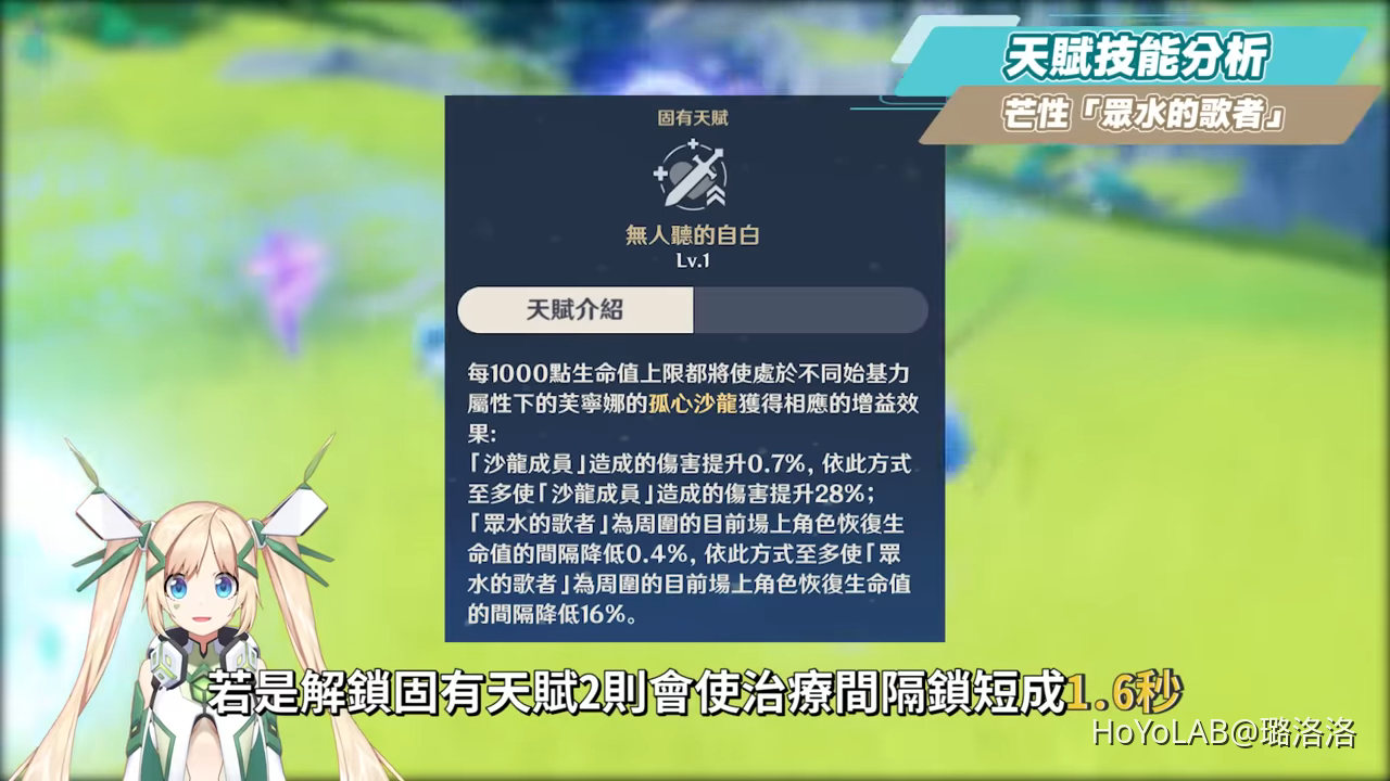 解鎖固有天賦1,芙寧娜可以提供全隊一個治療機制,只要場上角色受到治療時,治療的來源不是芙寧娜自己,接下來的4秒芙寧娜就會替全隊角色回復一次生命值,因此要觸發這項天賦效果的話,隊伍中就要再搭配另外一名有治療能力的角色,又尤其能快速疊加氣氛值的群補角色最佳。