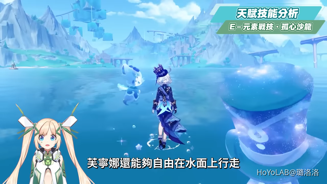 芙寧娜的元素戰技會邀請孤心沙龍的客人們上陣,依照芙寧娜當前始基力屬性的不同,也會讓登場的客人分為荒性的「沙龍成員」以及芒性的「眾水的歌者」。中間若是切換不同始基力屬性,也會直接切換成不同的客人。施放戰技時,芙寧娜還能夠自由在水面上行走,並且由於芙寧娜的戰技是無空窗期的,等於能夠一直在水面上行走,能夠這麼輕鬆渡海的人,應該就只有水神一人吧!
