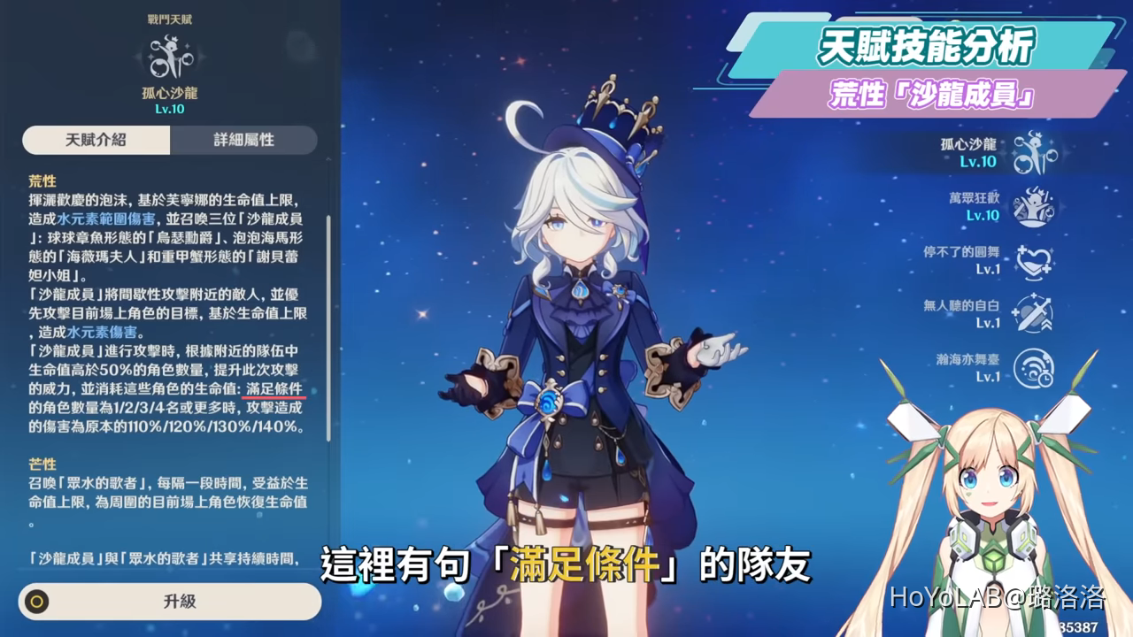 解鎖固有天賦2,可以透過芙寧娜的生命值上限來提高戰技的傷害和縮短治療間隔,要吃滿最大上限的話需要芙寧娜的生命值堆到40000,這樣就能使「沙龍成員」的造成傷害提高到28%、「眾水的歌者」治療間隔也會縮短到1.6秒。