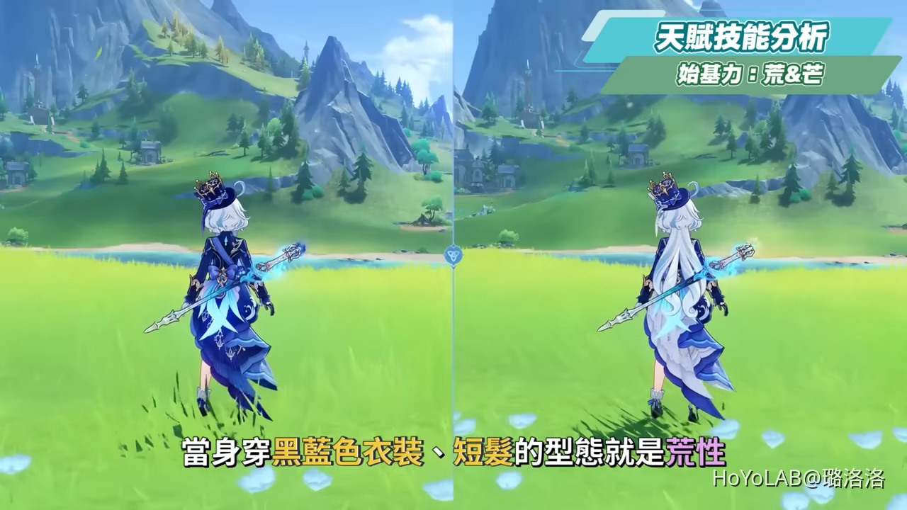 當身穿黑藍色衣裝、短髮的型態就是荒性、而身穿白藍色衣裝、雙馬尾的型態就是芒性。初始登場芙寧娜都會預設為荒性。芙寧娜的荒/芒屬性攻擊都有各自不同的獨立冷卻時間,都是6秒,因此可以在使出荒性的流湧之刃後、可以再立即切換成芒性使用靈息之刺,而芒性傷害的靈息之刺雖然是水元素傷害,但並不會造成水元素附著,和其他的楓丹角色一樣,主要用來在楓丹解謎使用,不過更重要的還是在於與戰技聯動的召喚物機制。而若是在水下時就沒有辦法任意切換荒/芒屬性,要在水面上切換好之後再下水。