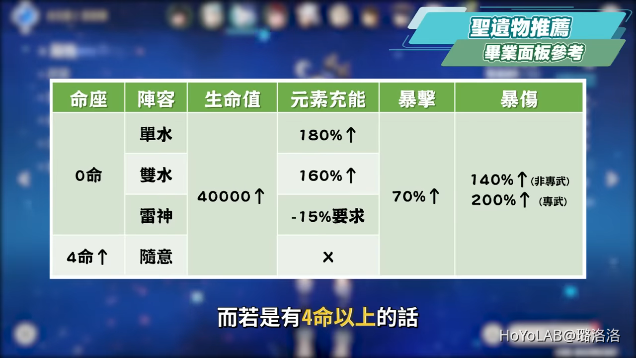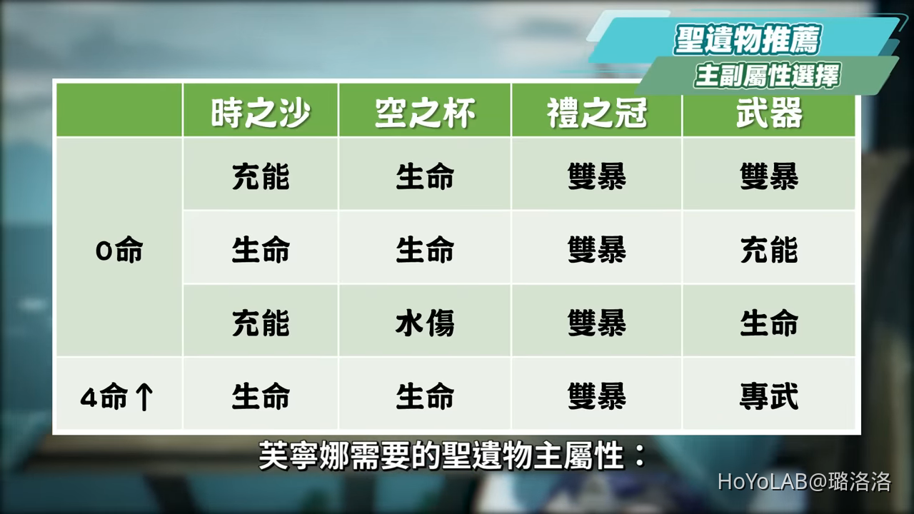 聖遺物主副屬性選擇,主要也要先從芙寧娜的核心屬性來先要求,再來根據命座的不同、隊友的組成不同,在充能面板上的需求也會有所不同,因此洛洛這邊主要整理了一些不同情況下的芙寧娜需要的聖遺物主屬性: