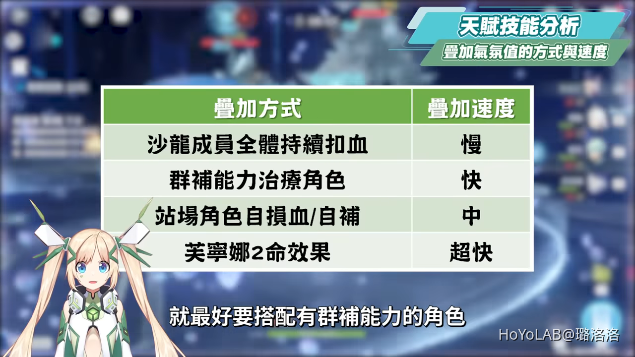 這裡也提供一些關於疊加氣氛值的方式與疊加速度參考,從表中可以看到若是不考慮被敵人攻擊受傷的話,0命狀態下要快速疊加氣氛值就最好要搭配有群補能力的角色,像是白朮、琴、心海、芭芭拉、瑤瑤、早柚、七七、米卡、迪奧娜、夏洛蒂這種。若是沒有的話,就會讓氣氛值疊滿的時間需要拉長,而若是要讓疊加速度最快,就可以考慮往1命直接保底150點氣氛值、或是2命的超快疊加速度。只要氣氛值疊加得越快,就能讓全隊快速提高總傷害,雖然有點類似夜蘭的天賦增傷效果,但夜蘭的天賦增傷效果是隨著時間而逐漸疊加到最大增傷,而芙寧娜的增傷只要你疊加速度越快,就能越快吃滿增傷上限。