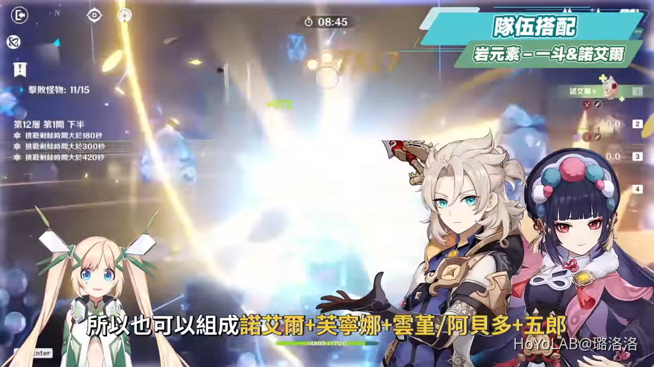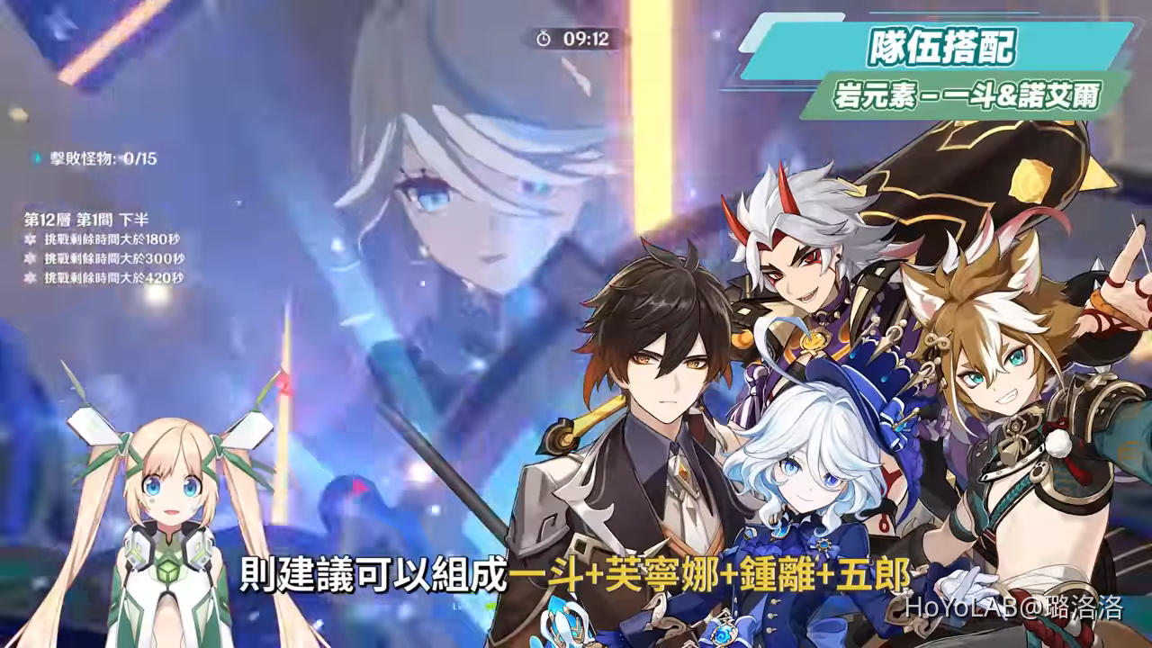 而若是換成一斗的岩元素隊伍的話,則建議可以組成一斗+芙寧娜+鍾離+五郎,這裡芙寧娜也會建議最好在2命以上,提供保底150點氣氛值和快速疊加的效果,不然一斗比較不像諾艾爾有那樣的群補能力,再透過鍾離提供的安心護盾和減抗、五郎的回血與加岩元素暴傷,真的是比起過去搭配莫娜或夜蘭當第4人時還要增加不少傷害和舒適度。