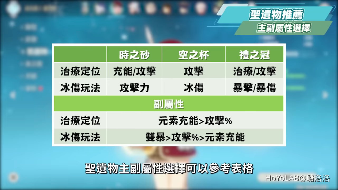 聖遺物主副屬性選擇可以參考表格,常態玩法為治療輔助,因此時之沙優先選擇元素充能,充能達標才選擇攻擊力,空之杯選擇攻擊力,禮之冠優先選擇治療加成,其次攻擊力。副屬性部分則可以優先選擇元素充能和攻擊力%。冰傷玩法的部分是屬於真愛黨,一般來說比較少人玩,提供一個方向參考。