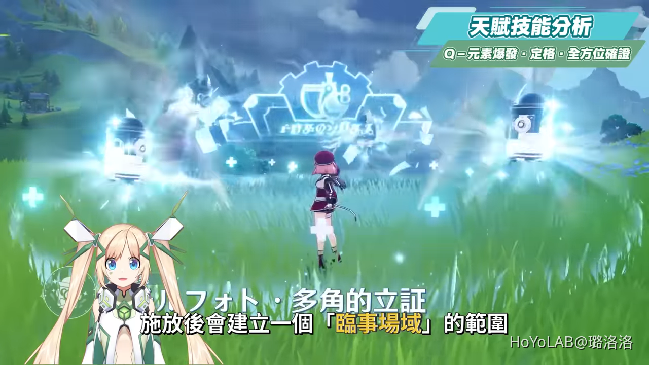 夏洛蒂的元素爆發為核心技能,也是主要的治療技能,能量需求80點,施放後會建立一個「臨事場域」的範圍,持續4秒,造成4次弱冰元素範圍傷害之外,也會持續替附近全隊角色恢復生命值,這樣的持續群補治療機制,非常適合搭配芙寧娜的技能機制。此外也因為能量需求比較高,所以在面板數值上要多注意堆疊元素充能。