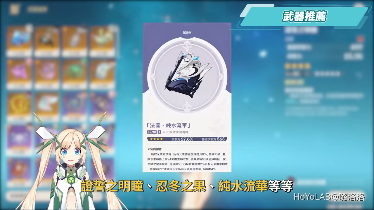 夏洛蒂的武器主要可以從充能、攻擊方面的來選擇,充能未達標優先選擇充能,達標後再考慮攻擊,充能方面的有西風秘典,需要堆疊暴率,攻擊方面則可以選擇天空之卷、塵世之鎖、證誓之明瞳、忍冬之果、純水流華等等。其中證誓之明瞳可以說是攻擊和充能兼具的法器,滿精煉可以在施放戰技後提供48%充能,因此充能大概180%左右就很夠回了。