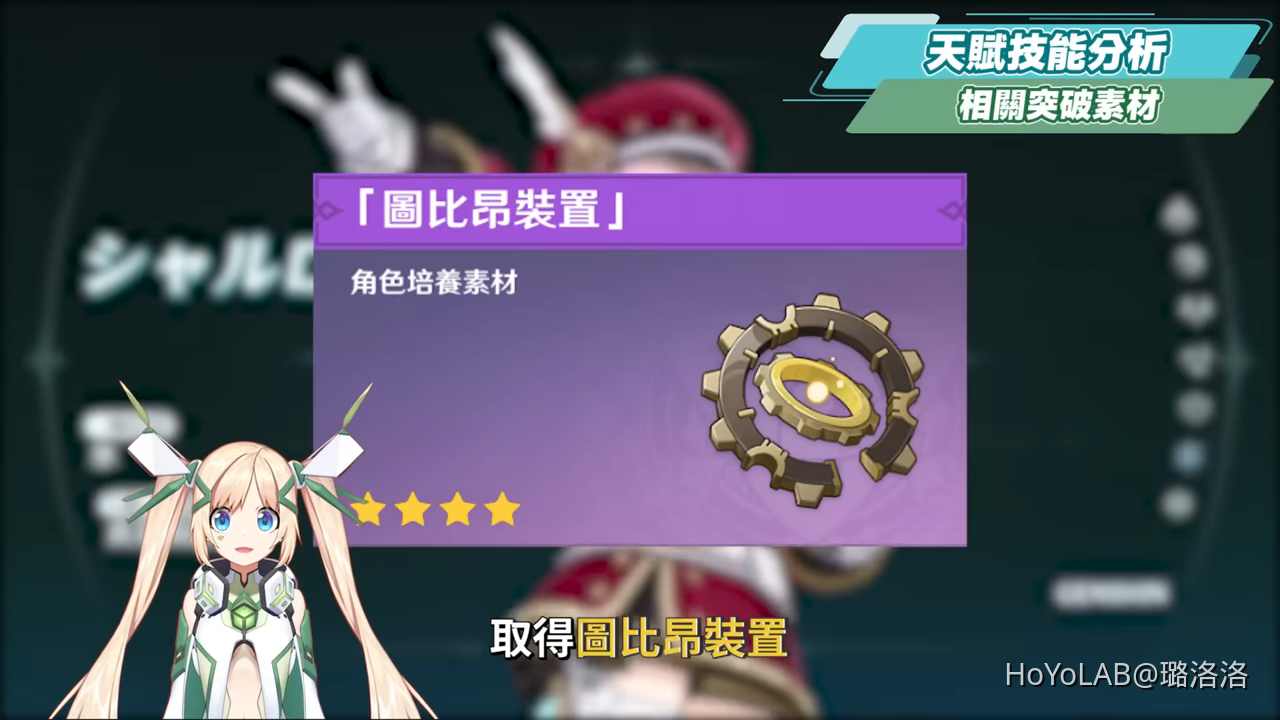 夏洛蒂的等級突破素材需要討伐楓丹野外BOSS實驗性場力發生裝置,取得圖比昂裝置,以及楓丹特產蒼晶螺,還有討伐發條機關掉落的齒輪,天賦突破素材為周二/五/日開放的正義系列,若是天賦技能6以上,則會需要消耗4.2新週回BOSS吞星之鯨所掉落的無光絲線。