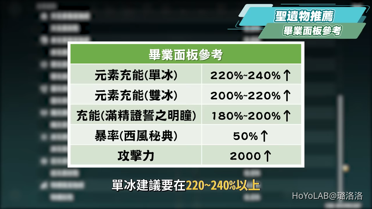 夏洛蒂的畢業面板參考,優先讓元素充能達到無縫循環目標,單冰建議要在220~240%以上,雙冰則建議在200~220%以上,若是拿證誓之明瞳這種武器被動效果在施放技能後增加回能的,就自己再把充能加上目前的*充能面板。其次攻擊力大約2000以上,若是拿西風秘典之類的武器,則暴率建議至少50%以上,若是放在雙冰隊伍比較容易暴擊,暴率可以稍微再降低。