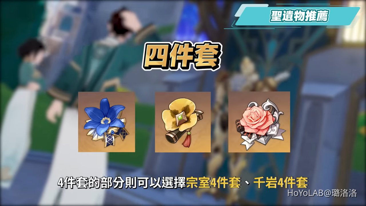 4件套的部分則可以選擇宗室4件套、千岩4件套,或是少女4件套,前面兩件套裝主要都是配合吃攻擊力的主C,而若是搭配像是那維萊特、芙寧娜這種吃生命倍率的輸出的話,就比較不適用這兩套。少女4件套則是可以更加提高治療量,不過前面提到的2+2混搭配法就已經奶量很夠了。