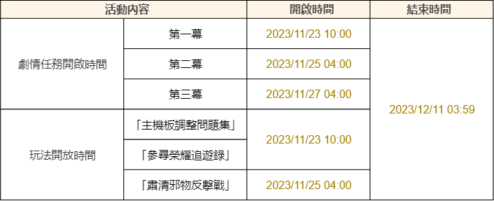 ● 活動期間,將陸續解鎖「主機板調整問題集」、「參尋榮耀追遊錄」、「肅清邪物反擊戰」各階段玩法。
