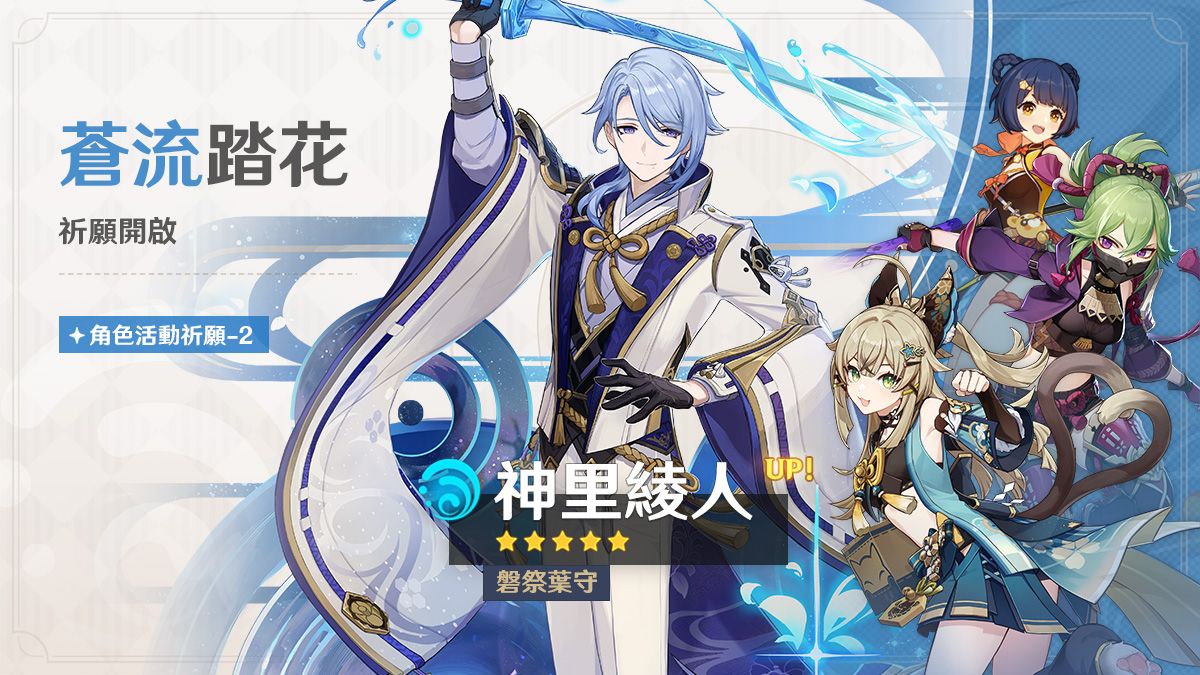 「蒼流踏花」祈願:「磐祭葉守·神里綾人(水)」機率UP!