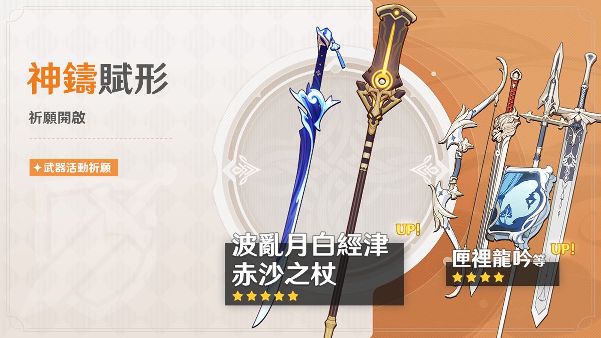 「神鑄賦形」祈願:「長柄武器·赤沙之杖」、「單手劍·波亂月白經津」機率UP!