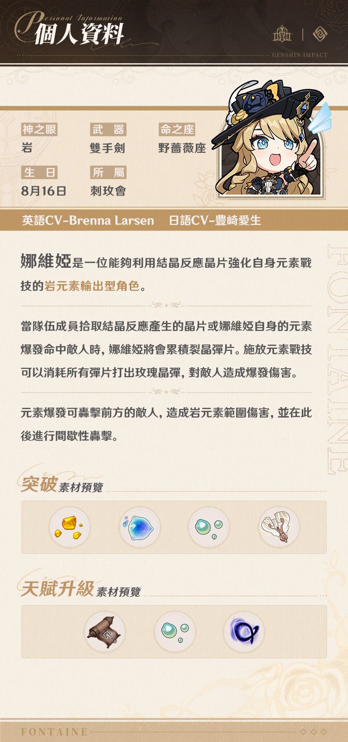 標籤:Genshin Impact 原神 娜維婭 明花蔓舵 玫瑰禮花!刺玫會特別訂製版。 角色 遊戲官方公告