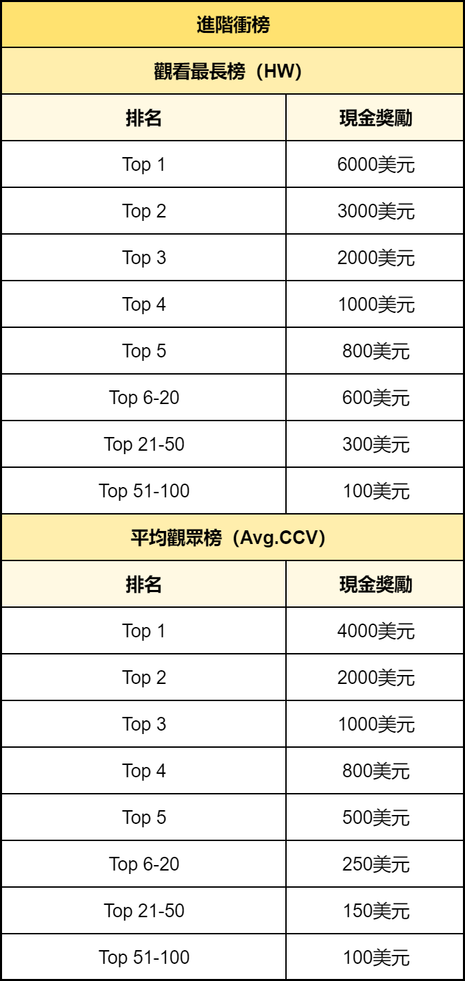 *「觀看最長榜」與「平均觀眾榜」的獎勵可以同時獲得,兩個排行榜的排名將會分開統計。