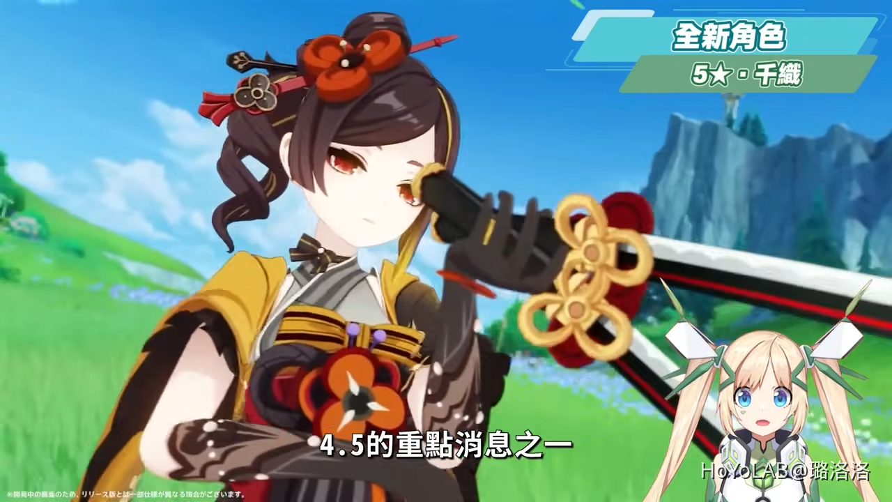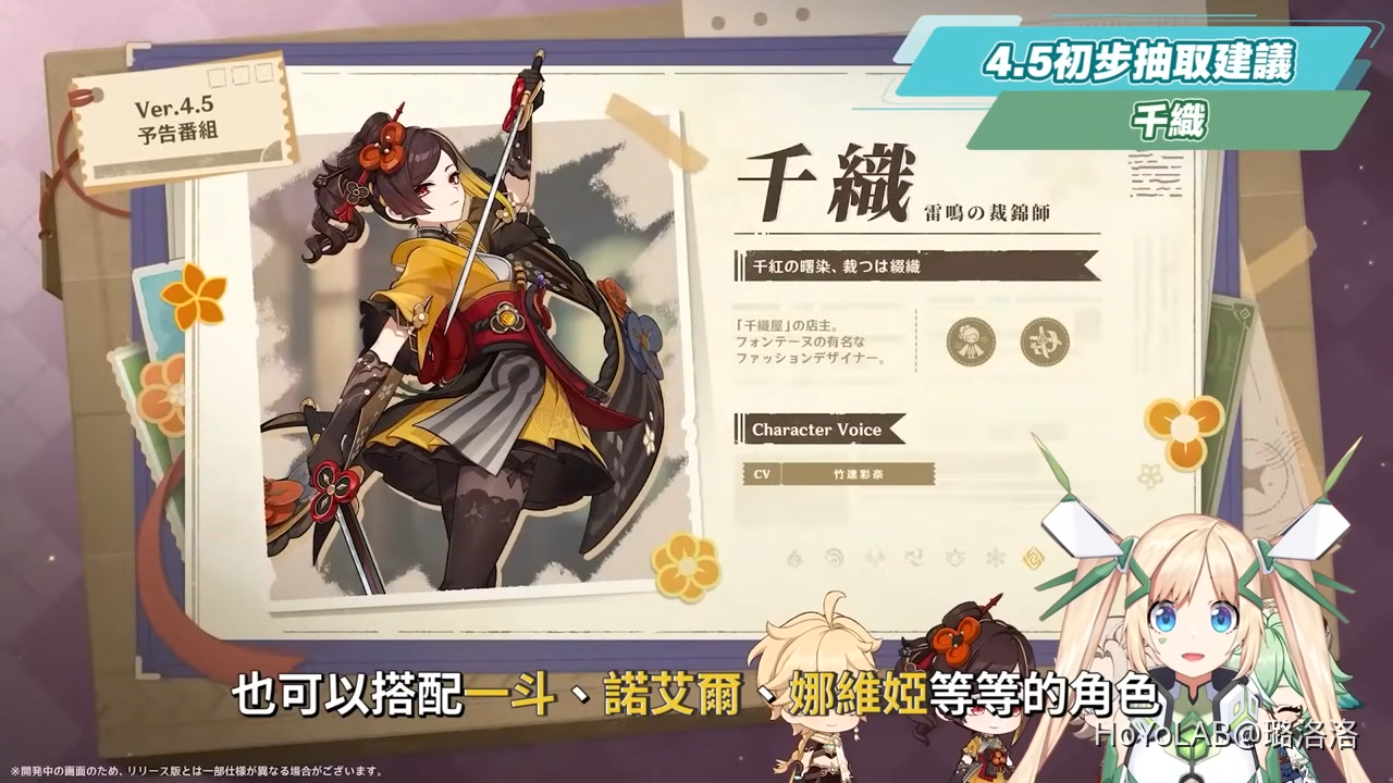 4.5的重點消息之一就是全新的岩元素五星單手劍千織的登場,從官方前瞻的畫面來看,千織的定位會比較偏向是速切副C,雖然是單手劍角色,但戰鬥方式是以手持雙刀的形式,非常俐落帥氣,也是岩元素角色中少有的輕便單手劍攻擊,元素爆發為岩元素範圍傷害,核心傷害主要以元素戰技為主,施放元素戰技後,除了進行一次上挑的攻擊之外,千織還可以召喚一個岩元素召喚物人偶「袖」,若是場上還有其他岩造物,或是有岩造物被創造出來的話,還可以再額外召喚出一名「袖」,每隔一段時間「袖」就會對周圍敵人進行岩元素範圍攻擊,此外當千織長按E戰技時,也會有類似刻晴、海哥那樣的對空瞄準效果,而千織在使用戰技後上挑攻擊的這段時間中,若是再次按下E戰技,就可以直接切換到隊伍中的下一名角色出場,有種類似QTE的換角方式,而若是施放戰技後,千織使用的是普攻,則會獲得短暫的岩元素附魔,可以進行一段時間的站場普攻輸出。另外千織的固有天賦中也有一項比較特別的加移速效果,只要隊伍中角色穿上了非預設服裝的衣裝,或是配戴初始之翼以外的風之翼,都可以獲得增加移動速度的效果。而千織的傷害也會基於部分攻擊力和防禦力,同時又以戰技傷害為主,因此初步就可以判定千織的聖遺物套裝可以準備一些防禦力主屬性相關的劇團套或是華館套了。