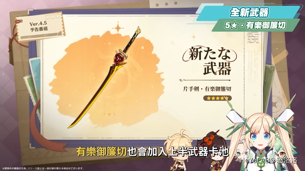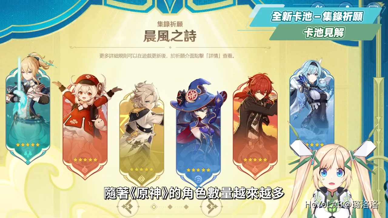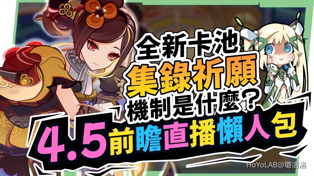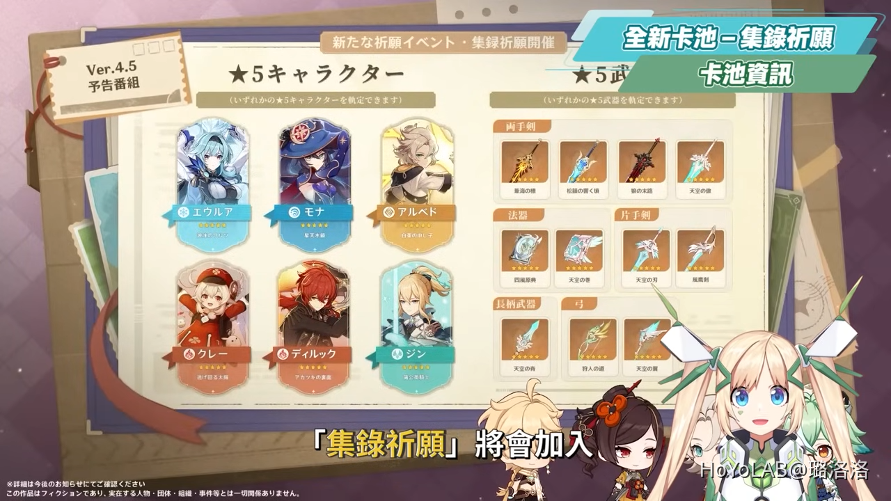 4.5另外一項重大消息,就是全新的卡池機制「集錄祈願」將會加入,改版後我們就可以在2個限定角色池之外看到這個卡池,所以也可以看成是版本期間的第三個卡池。集錄祈願主要是可以抽一些復刻角色和武器的卡池,目前第一次的集錄祈願卡池內容可以參考畫面,五星角色有優菈、莫娜、阿貝多、可莉、迪盧克、琴,五星武器則有天空之刃、風鷹劍、葦海信標、松籟響起之時、狼的末路、天空之傲、天空之脊、四風原典、天空之卷、獵人之徑、天空之翼等等。