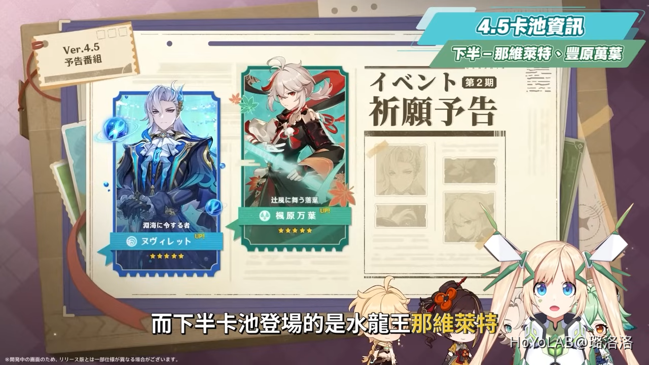 而下半卡池登場的是水龍王那維萊特,以及六大人權角其中之一的楓原萬葉,那維萊特可以說是操作上手簡單、傷害也是直接暴力的水元素直傷角色,而楓原萬葉則是水/火/冰/雷四大元素直傷角色都必定會帶上的T0增傷輔助,假如上半卡池是設計給純岩輸出愛好者,那麼下半卡池就是提供給元素直傷愛好者的抽取環境。那維萊特由於是首次復刻,洛洛會在下半卡池到來之前製作相關的復刻Q&A,大家也可以先追蹤洛洛的Instagram,屆時會在上面發布限時動態蒐集一下大家對於水龍王相關的問題,再整理到影片中,而楓原萬葉也有非常多相關的影片,不熟的萌新也可以參考洛洛先前做過的影片,或是影片稍後的4.5初步抽取建議。