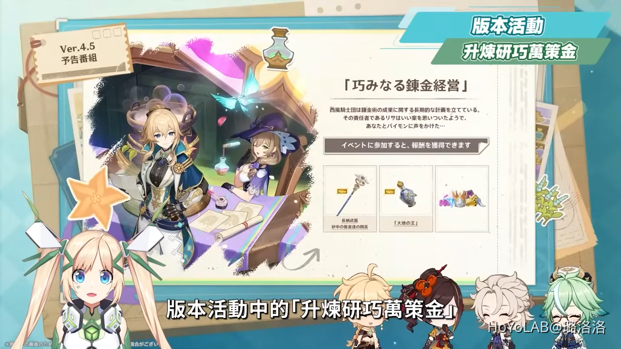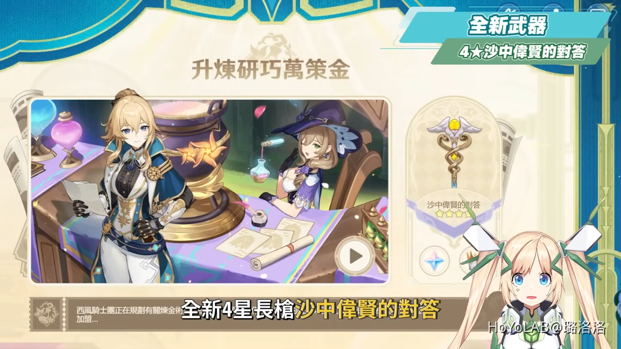 版本活動中的「升煉研巧萬策金」,蒙德的麗莎在近期對於煉金術有些想法想和我們分享,因此邀請了我們和他來加盟,活動玩法主要是開設店鋪,再透過出售煉金藥劑的形式來了解需求,同時打響知名度,過程中也會需要種植藥材、煉製藥劑、販賣藥劑,最後替店鋪增加營收,並且擴大經營規模,總體來說是一種經營養成的玩法。完成活動還可以獲得免費滿精煉四星長槍「沙中偉賢的對答」,以及原石和素材等獎勵。