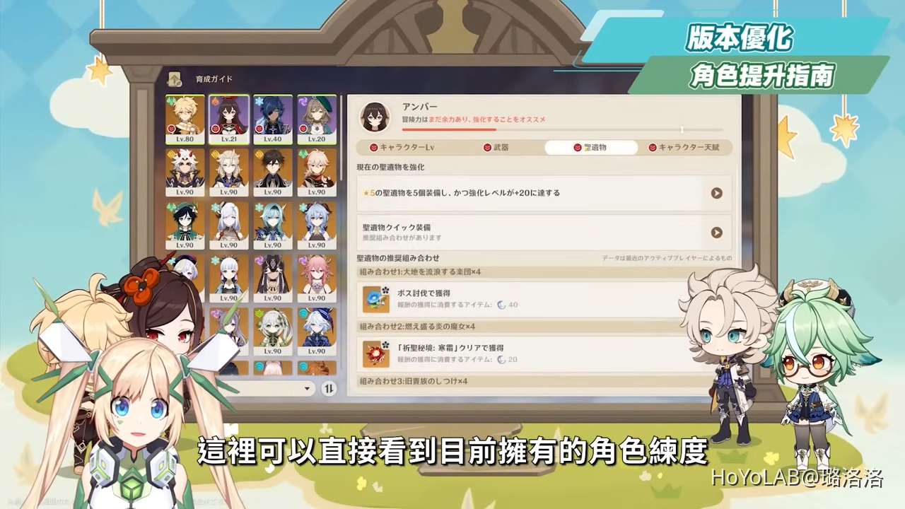 另外一個是對於萌新友好的新功能,只要冒險等級大於12級,並且完成任務「歡迎來到冒險家協會」,就可以從指南中點選進入,這裡可以直接看到目前擁有的角色練度還有哪裡不足,可以按照指南提供的指示來培養角色,像是新手最常忘記升級的天賦等級,其他還有角色等級、武器、就連聖遺物強化的建議等級要到+8這樣明確的指示也都有,也會告訴你建議要去刷的聖遺物套裝,簡直是超方便的內建健檢工具呢。