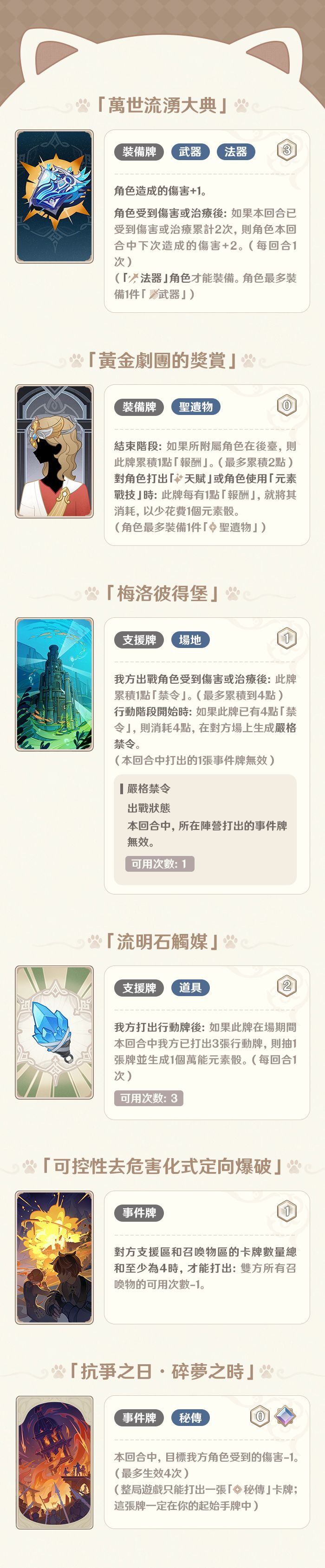 4.5版本更新後,前往貓尾酒館與角色進行邀約對局,達成指定挑戰目標可獲得角色牌及對應天賦牌。行動牌「萬世流湧大典」、「黃金劇團的獎賞」、「梅洛彼德堡」、「流明石觸媒」、「可控性去危害化式定向爆破」、「抗爭之日·碎夢之時」可在卡牌商店中購買。