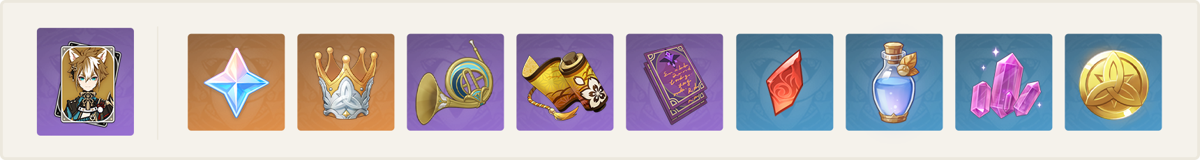 ●完成各個玩法,可獲得「虹色巡迴券」。收集指定數量的「虹色巡迴券」可邀請「戎犬鏘鏘·五郎(岩)」,同時還可以獲得「晚風圓號」、原石、智識之冕、角色天賦素材、摩拉等獎勵。