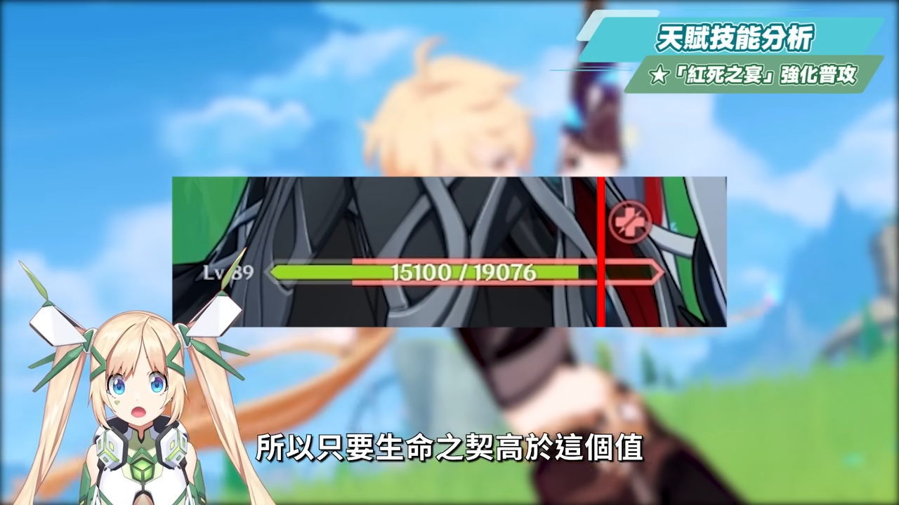 「紅死之宴」是僕人的核心機制,當重擊回收了戰技附加在敵人身上的印記後,只要當前生命之契高於30%以上生命值,僕人就可以透過每下強化普攻消耗身上7.5%的生命之契,並且會減少1次E戰技的冷卻時間0.8秒。前面有告訴大家如何判斷生命之契的比例,若是生命之契低於30%時,就會解除「紅死之宴」的強化普攻狀態,而生命之契30%等於生命值15%的位置,因此在判斷時主要可以記大概這個位置: