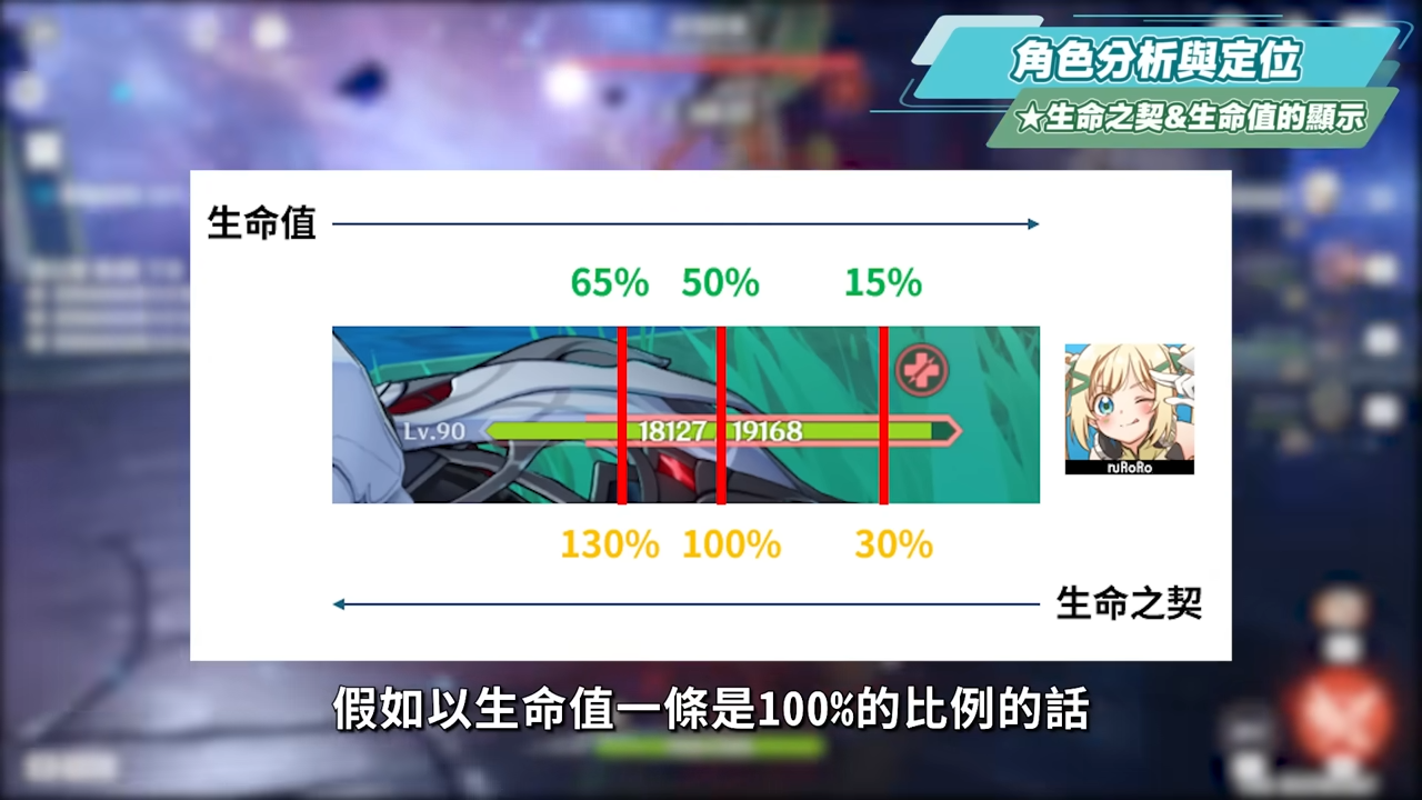也因為稍後就會再進入更深入的僕人技能機制說明環節,也會提到一些關於生命之契和生命值百分比的一些數字概念,這裡我們可以先知道生命值和生命之契的百分比是會以1:2的比例來顯示。假如以生命值一條是100%的比例的話,從0~100%是從左到右開始算,而包覆在上面的生命之契就是以生命條長度的比例×2,從0~200%是右到左來增加,所以假如當前僕人的生命值上,被包覆著大概65%生命值左右的生命之契,就代表此時的生命之契為130%,也就是65%×2的結果。