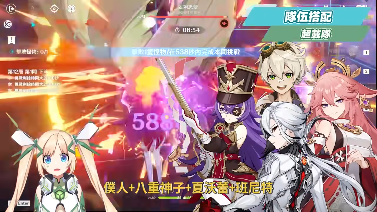 超載隊的核心為夏沃蕾,圍繞著火與雷元素的隊員來組成,這裡示範的組成為僕人+八重神子+夏沃蕾+班尼特,八重神子的位置可以替換類似的掛雷角色,像是菲謝爾、雷電將軍等等,輸出可以是僕人E→八重神子3E→夏沃蕾Q+長E→班尼特QE→僕人重擊+普攻一輪+Q+重擊+普攻。