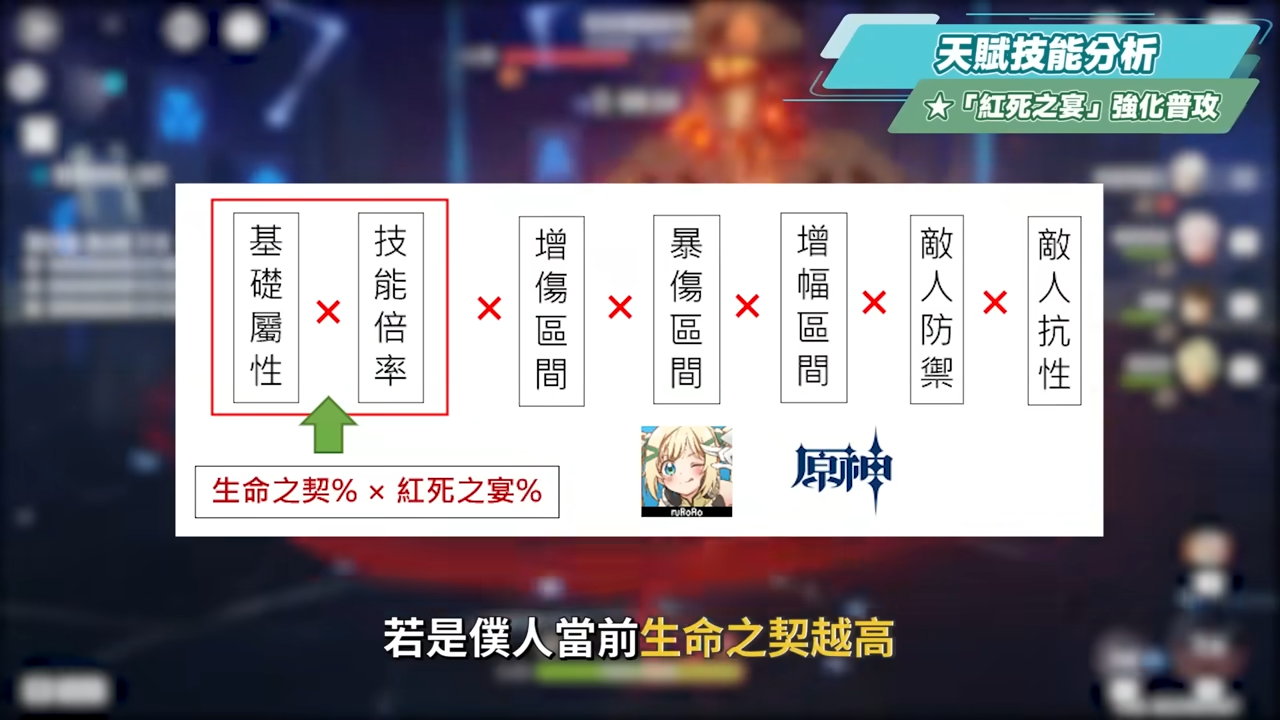 洛洛自己記的位置大概是差不多快碰到那顆圓形的生命之契圖標時,就代表快要到29%了,所以只要生命之契高於這個值,就都能維持「紅死之宴」的狀態。而強化普攻的生命之契消耗,是只要有命中就會消耗,像是打在護盾上也會消耗,而此時普攻也會從一般的物理傷害,轉化為無法被附魔的火元素傷害,普攻、重擊、下落的火附著都是弱火,因此0命的夜蘭可以壓住僕人的掛火,只是偶爾實戰時有的普攻有前後搖,因此觸發並不是那麼穩。若是僕人當前生命之契越高,僕人造成的傷害也就會越高,提高的傷害區屬於是基礎倍率區間,直白一點理解就是僕人自帶普攻的攻擊加成,也因為只限於普攻,所以重擊和下落都吃不到。